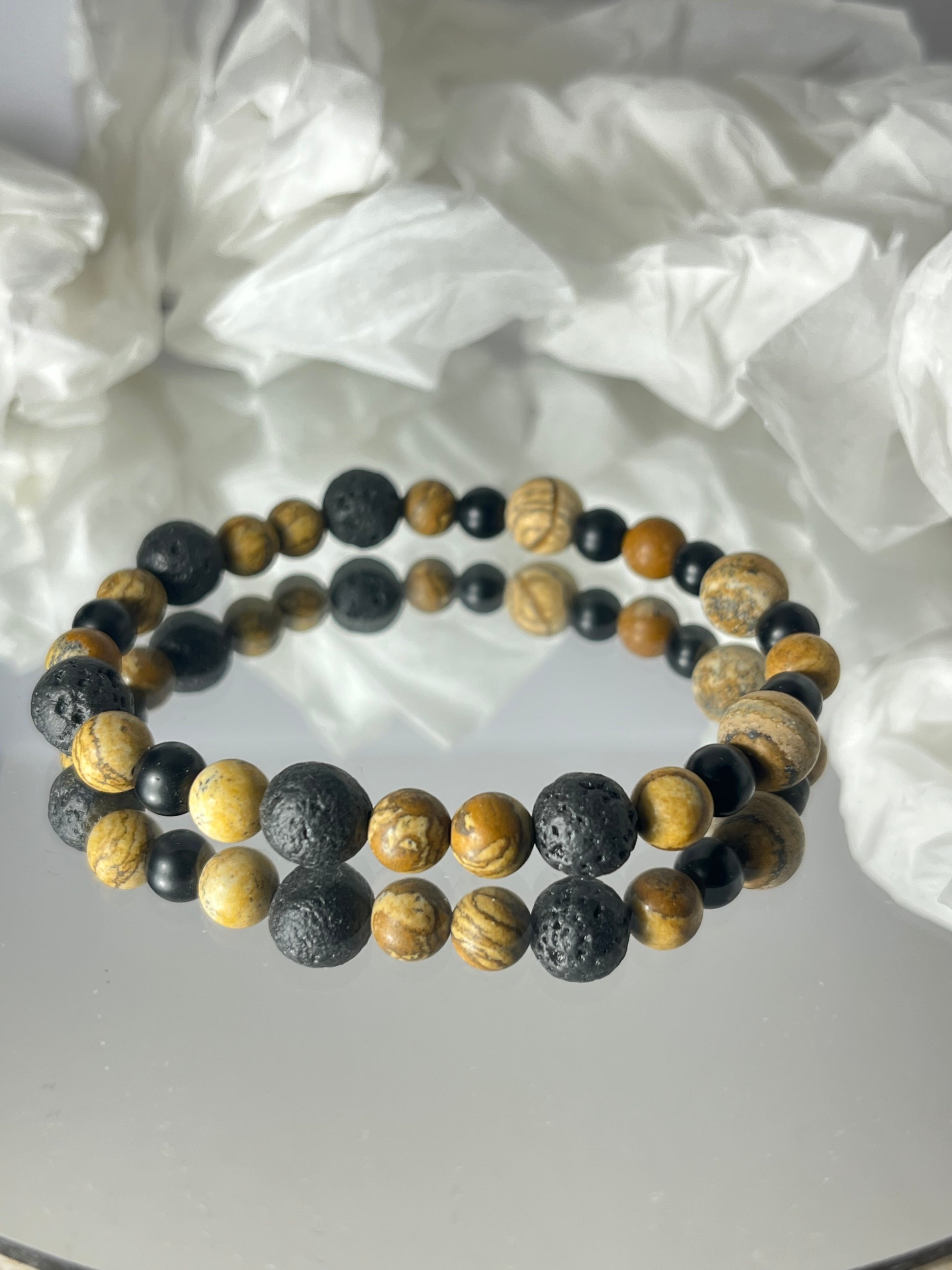 Ciepłe beże i brązy jaspisu połączone z surową czernią lawy.