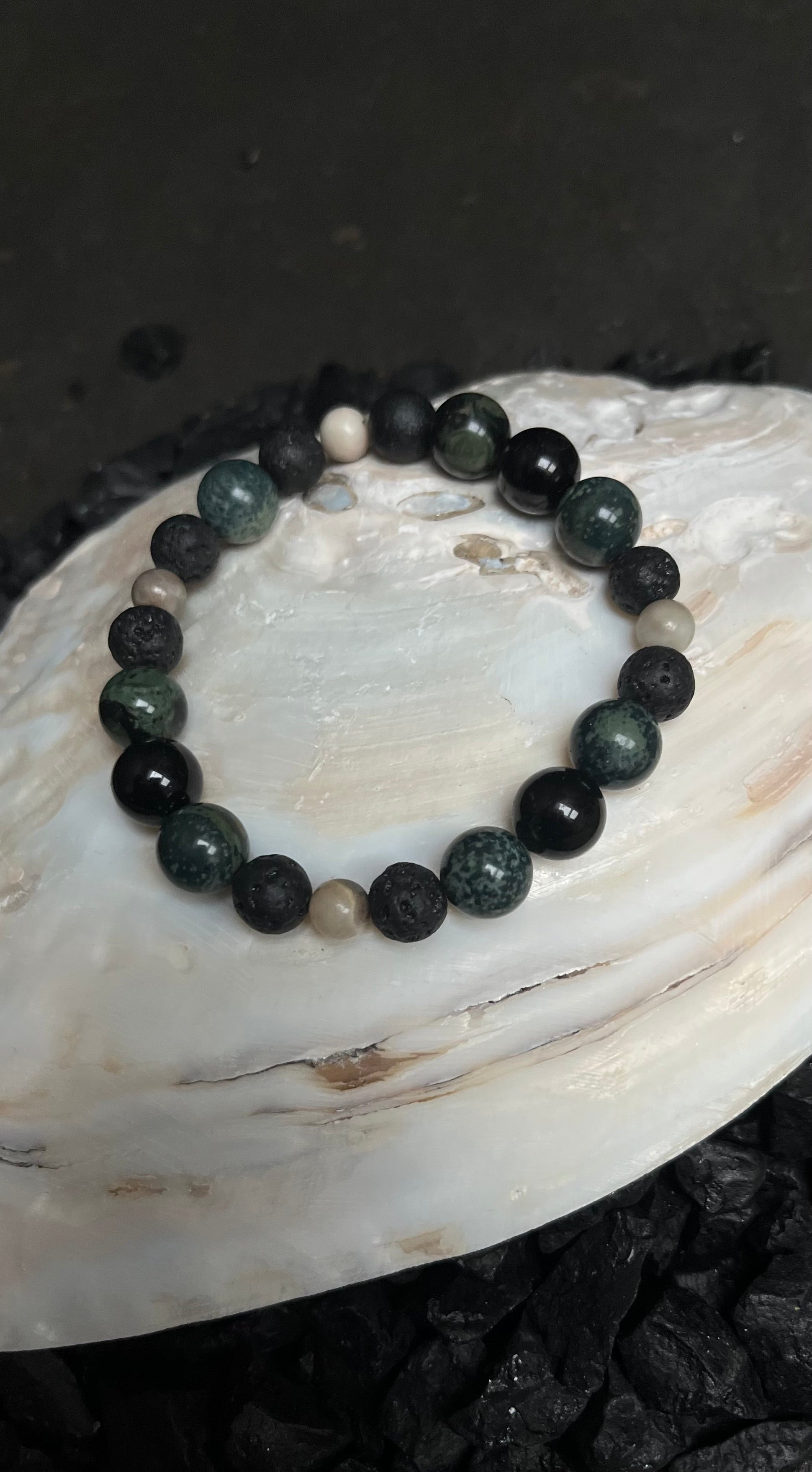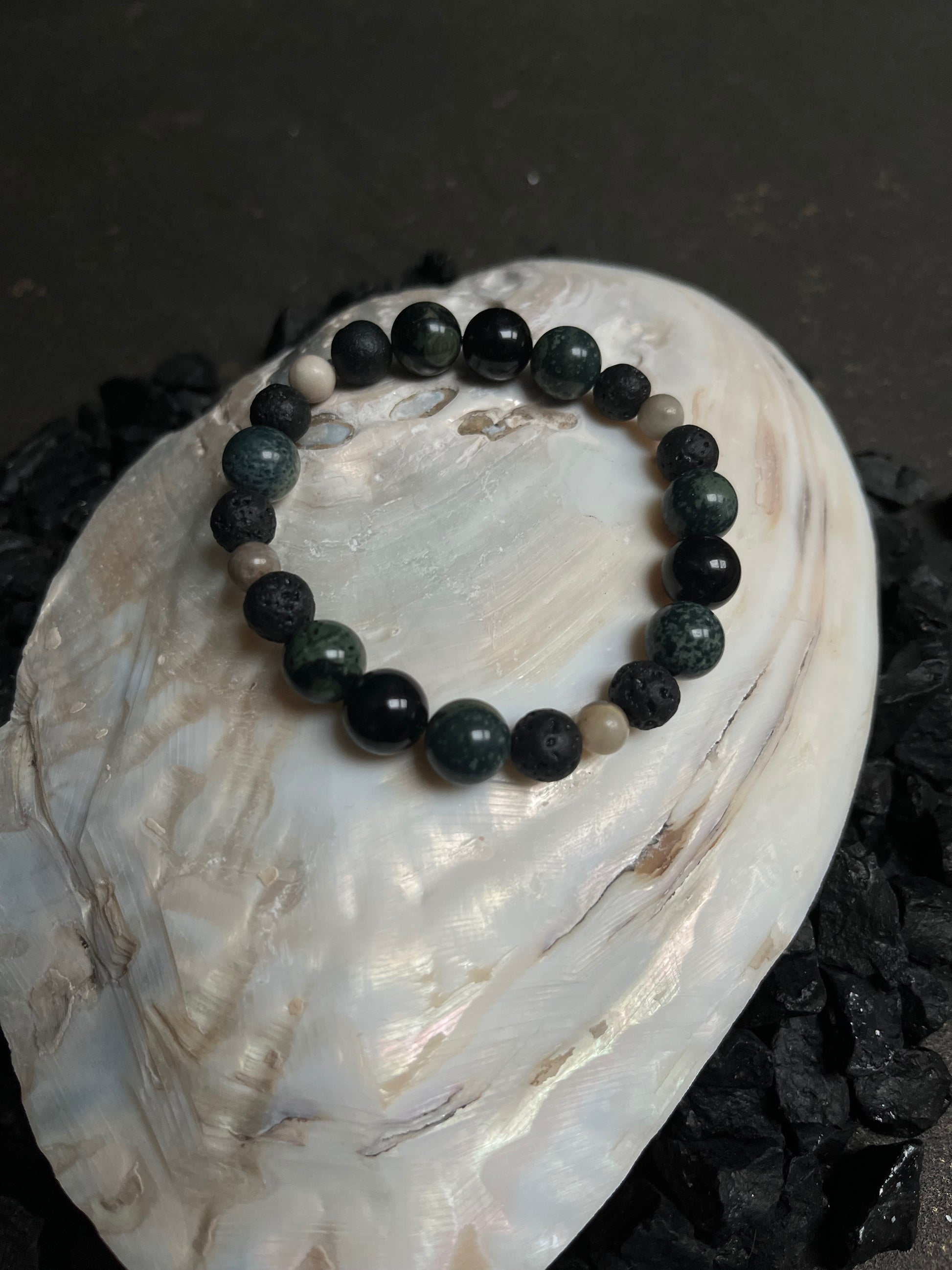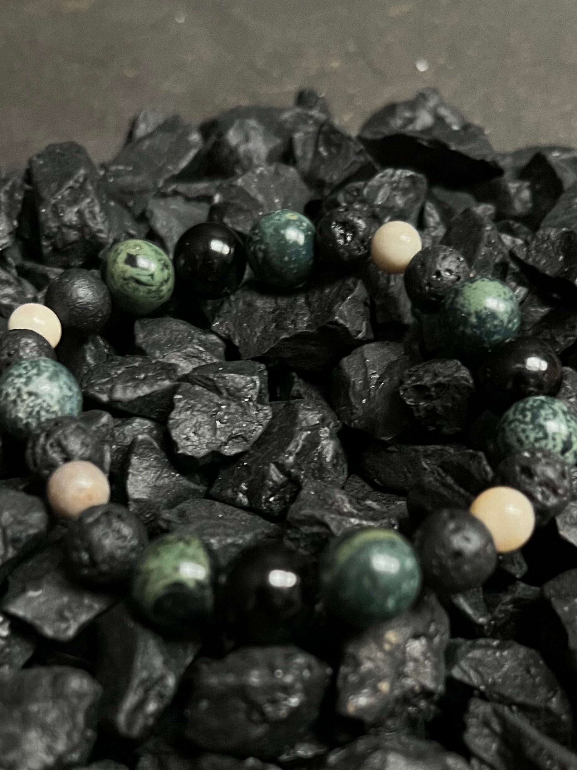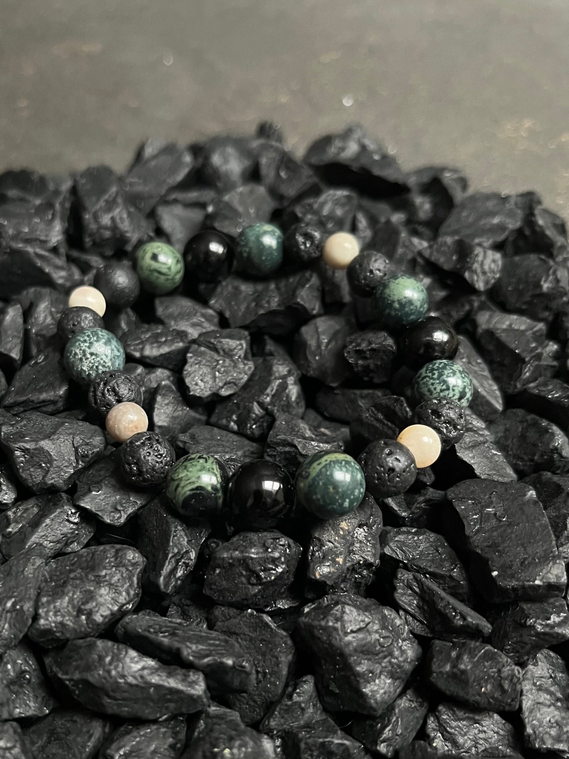 kamienie naturalne: czarny turmalin, amazonit, jaspis kambaba, lawa wulkaniczna